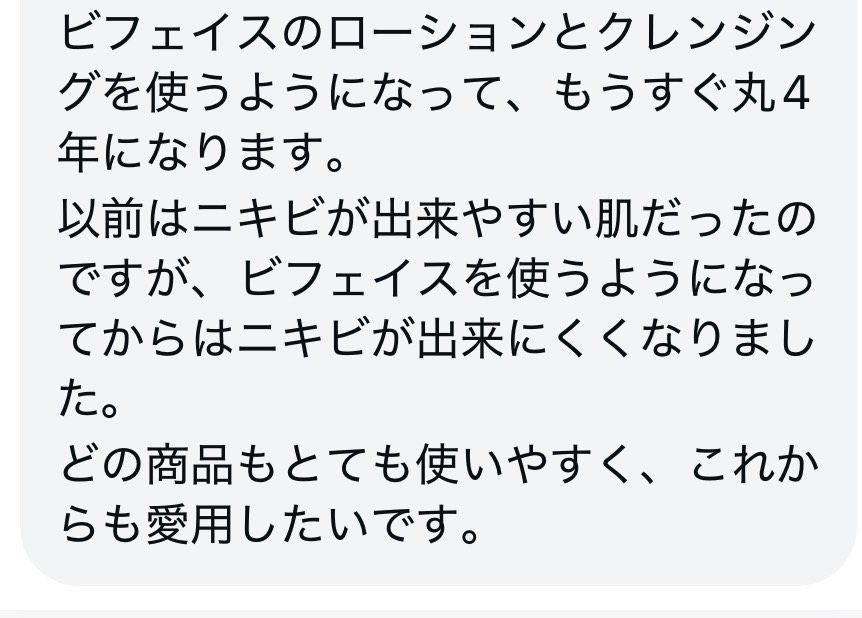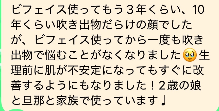 「10年以上吹き出物で悩んでいたけれど、ビフェイスを使ってから一度も悩まなくなった」